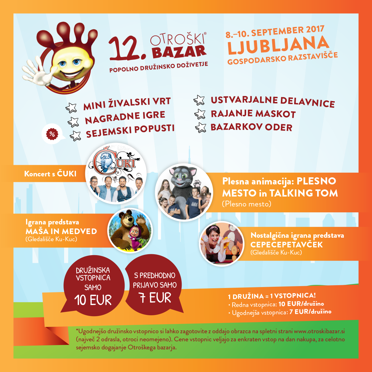 12. sejem za družine bo potekal od petka do nedelje, od 8. do 10. septembra, tradicionalno pa bo poskrbel za bogato sejemsko ponudbo, nakupe s sejemskimi popusti, brezplačne delavnice za najmlajše, številne športne aktivnosti, glasbene, plesne in gledališke nastope in še in še. Na odru bodo nastopali Nipke, plesalci plesne šole X Planet, Rebeka Dremelj, Plesno mesto in Talking Tom, številne maskote in Čuki!