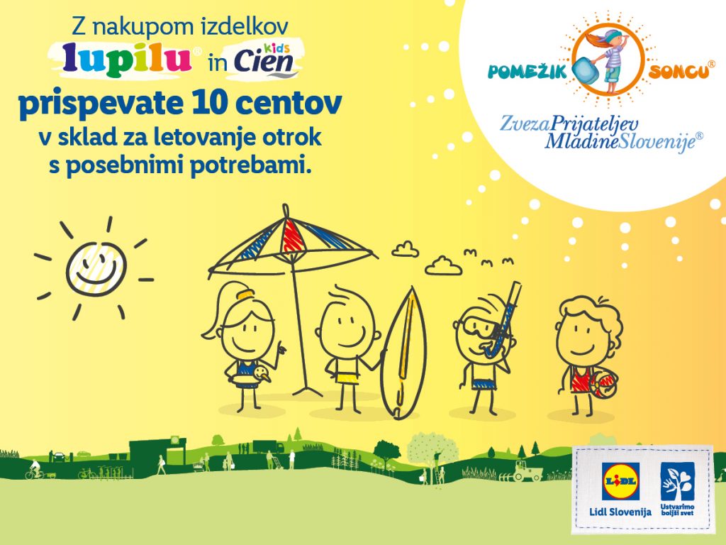 Lidl Slovenija je tudi letos pristopil k sodelovanju z Zvezo prijateljev mladine Slovenije (ZPMS) v dobrodelni akciji Pomežik soncu. V maju in juniju bodo od vsakega prodanega izdelka iz redne ponudbe znamke Lupilu in Cien Kids (nekdaj Cien Baby) prispevali 10 centov za letovanje otrok s posebnimi potrebami.