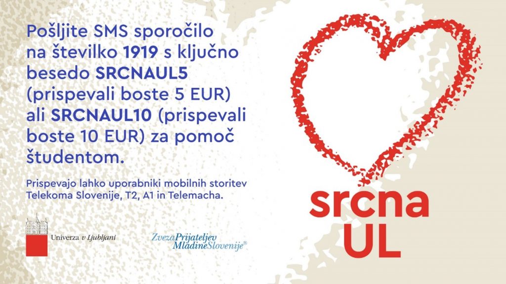 S podpisom sporazuma med Univerzo v Ljubljani (UL) in Zvezo prijateljev mladine Slovenije (ZPMS) se je začela akcija Srčna UL. Z njo želimo pomagati študentkam in študentom Univerze v Ljubljani, ki so zaradi epidemije covida-19 ostali brez finančnih sredstev za preživetje. Mnogi med njimi so namreč izgubili študentsko delo in niso našli novega, ali pa so delo izgubili njihovi starši, skrbniki. Pomagati je mogoče s kratkim telefonskim sporočilom na številko 1919 s ključno besedo SRCNAUL5 (prispevek 5 EUR) ali SRCNAUL10 (prispevek 10 EUR). Sredstva se lahko nakaže tudi na transakcijski račun ZPMS ali s sklenitvijo donatorske pogodbe.