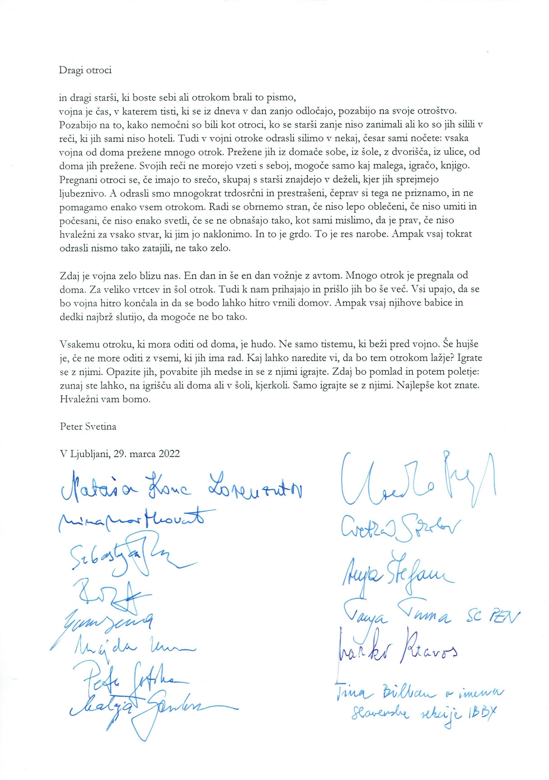 Vsakemu otroku, ki mora oditi od doma, je hudo. Ne samo tistemu, ki beži pred vojno. Še hujše je, če ne more oditi z vsemi, ki jih ima rad. Kaj lahko naredite vi, da bo tem otrokom lažje? Igrate se z njimi. Opazite jih, povabite jih medse in se z njimi igrajte. Zdaj bo pomlad in potem poletje: zunaj ste lahko, na igrišču ali doma ali v šoli, kjerkoli. Samo igrajte se z njimi. Najlepše kot znate. Hvaležni vam bomo.