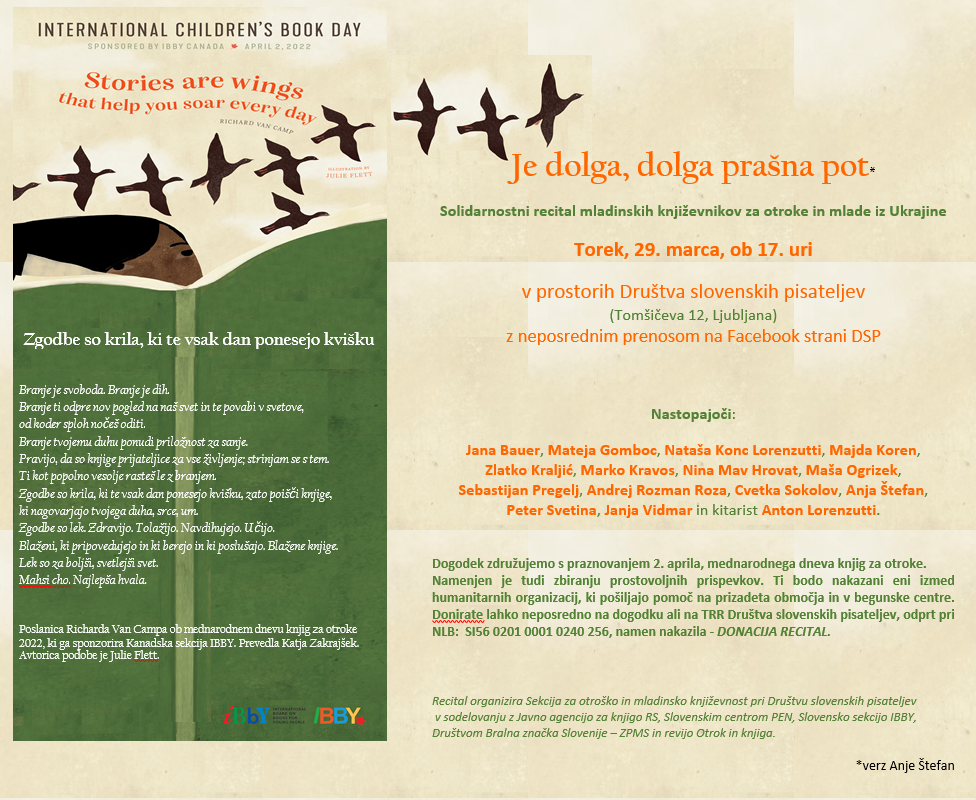 2. april na mednarodni dan knjig za otroke je v prostorih Društva slovenskih pisateljev potekal solidarnostni recital mladinskih književnikov za mlade iz Ukrajine.
