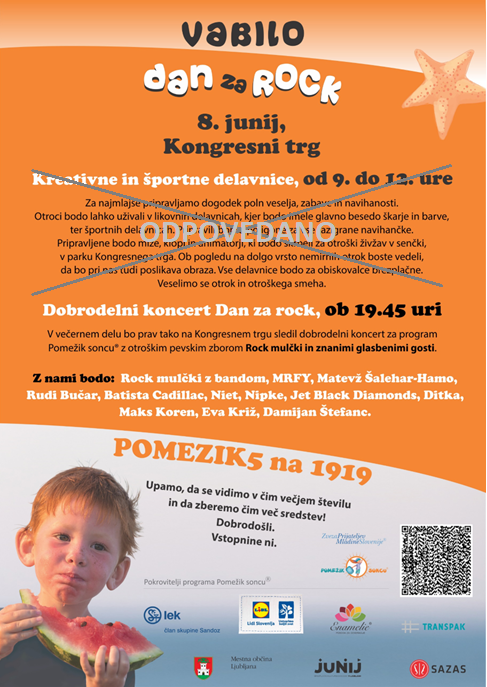 Obveščamo vas, da zaradi deževnega vremena v noči na sredo in nepredvidljivega vremena v sredo dopoldne, kreativne in športne delavnice za otroke v sklopu dogodka Dan za rock preklicujemo.