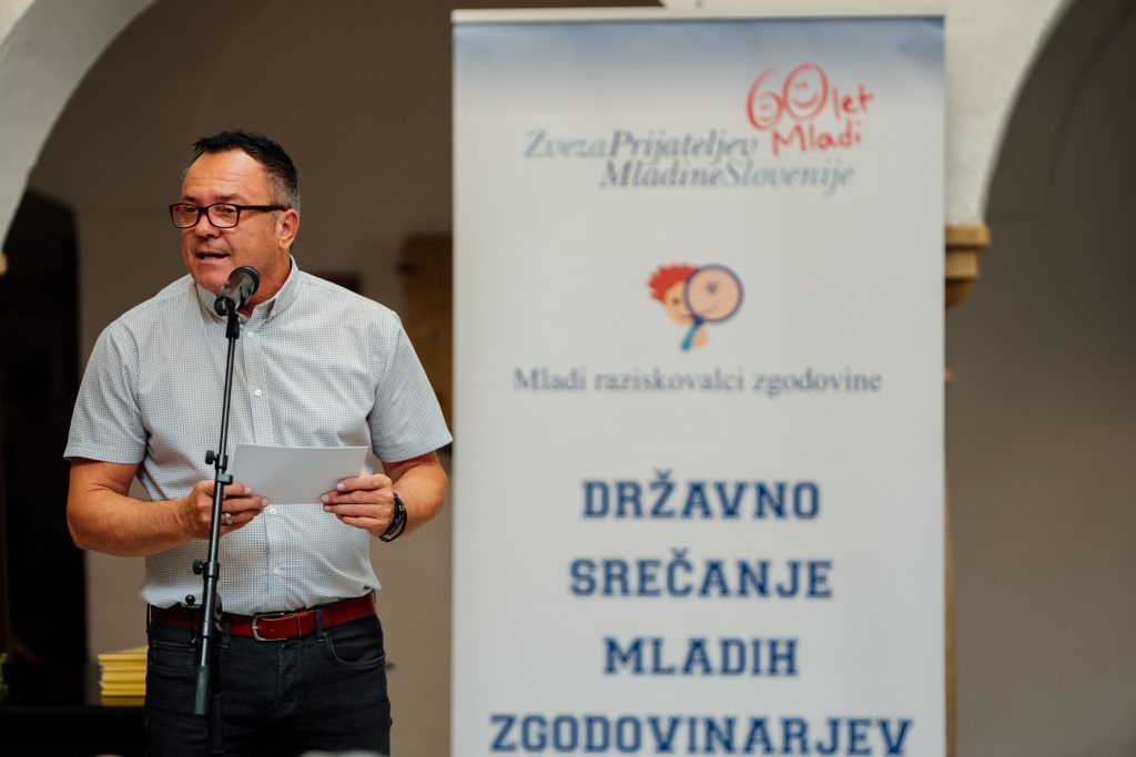 “Velenjski grad, kjer se danes družimo, je bil prvič omenjen leta 1270. Velja za najlepše ohranjen renesančni grad v Sloveniji. Ko se domačini vračamo v mesto, nas pogled nanj vedno poboža. Zavemo se, da smo doma. Zato smo veseli in ponosni, da danes prav na Velenjskem gradu, kjer od leta 1957 domuje Muzej Velenje, gostimo 53. državno srečanje Mladih raziskovalcev zgodovine. Verjamem, da ste danes spoznali, da je naše mesto sicer mlado, njegova zgodovina pa je zelo bogata. To pove tudi podatek, da smo v letu 1953, ko so 1. marca ustanovili Zvezo prijateljev mladine Slovenije, oktobra v stari stavbi takratne velenjske šole in nižje gimnazije ustanovili prvo društvo prijateljev mladine v takrat še veliki občini Velenje, ki jo danes sestavljajo MO Velenje, občina Šoštanj in Občina Šmartno ob Paki. Glavno vodilo ob ustanovitvi je bilo »Delajmo v prid otrok«. To je vodilo, ki ga naša prostovoljska organizacija na istem območju kot ob ustanovitvi, torej v vseh treh občinah Šaleške doline, kjer deluje 13 društev prijateljev mladine, uresničuje še danes. Lahko zatrdimo, da tudi danes skupaj z Zvezo prijateljev mladine Slovenije pišemo zgodovino organizacij, ki sta tesno povezani med sabo. V to, da ste med preučevanjem nalezljivih bolezni v preteklosti mladi raziskovalci zgodovine samo potrdili rek, da je zgodovina naša učiteljica, pa sploh ne dvomim,” nadaljuje Zdenko Gorišek, predsednik Medobčinske zveze prijateljev mladine Velenje.