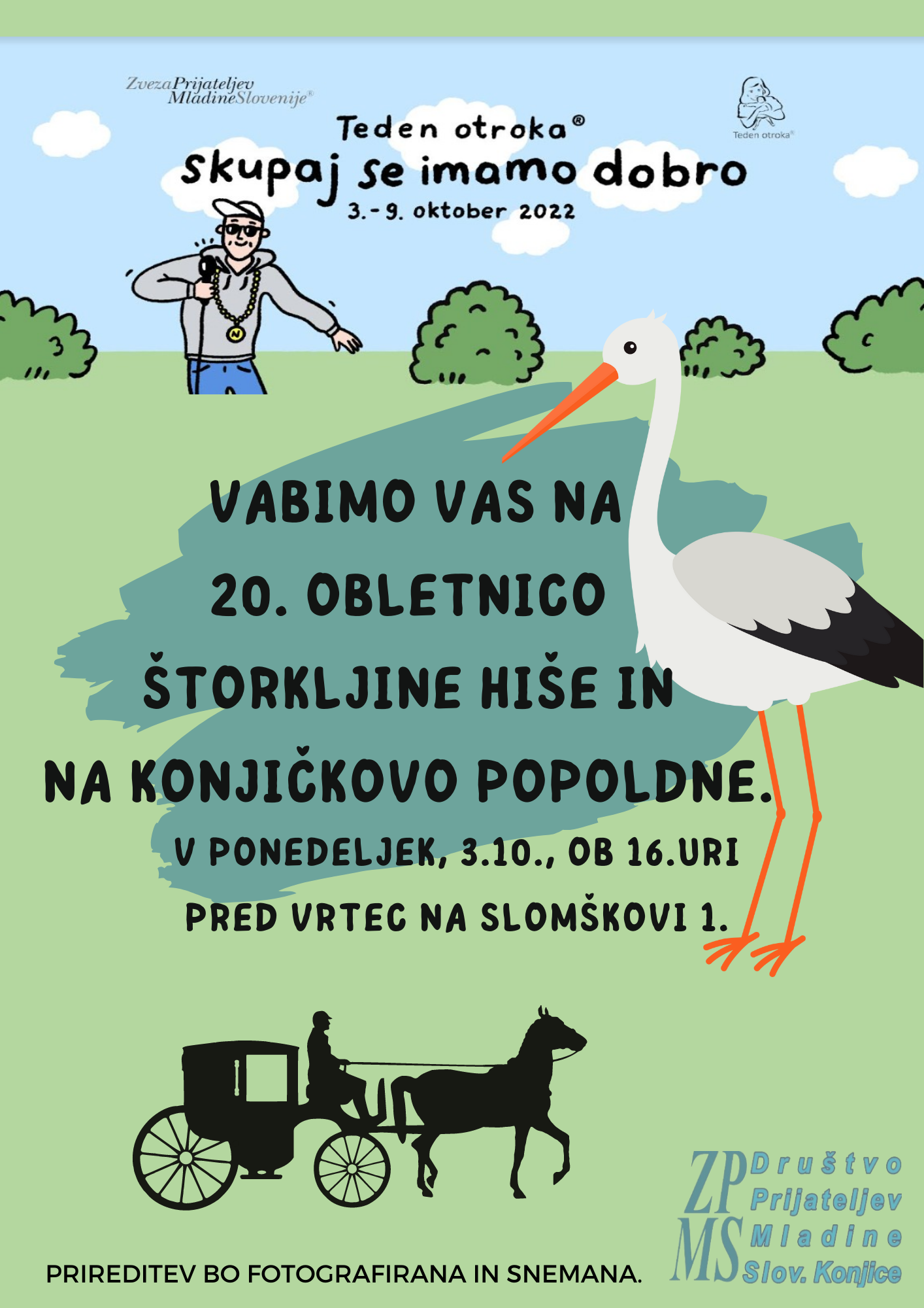 V Slovenskih Konjicah bomo letos po dolgem času ponovno organizirali tradicionalno Konjičkovo popoldne. Združili pa ga bomo s PRAZNOVANJEM 20 OBLETNICE ŠTORKLJINE HIŠE. Na Konjičkovem popoldnevu bomo za otroke organizirali predstavo in nato pripravili ustvarjalne delavnice na temo štorkelj. Na prireditev pa bo otroke pripeljal turistični vlakec.