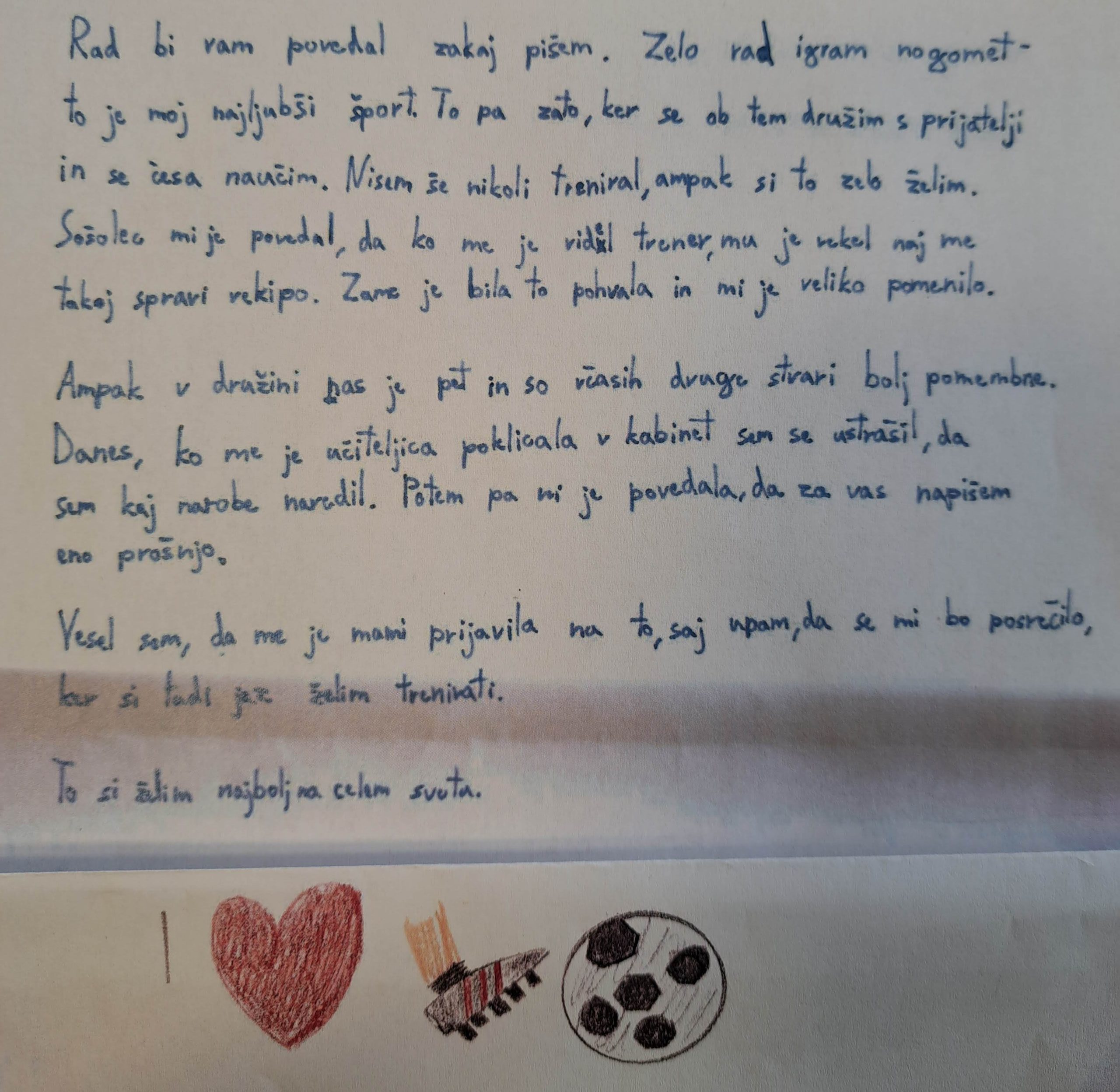 »Rad bi vam povedal, zakaj pišem. Zelo rad igram nogomet – to je moj najljubši šport, to pa zato, ker se ob tem družim s prijatelji in se česa naučim. Nisem še nikoli treniral, ampak si to zelo želim. Sošolec mi je povedal, da ko me je videl trener, mu je rekel, naj me takoj pripelje v ekipo. Zame je bila to pohvala in mi je veliko pomenilo. Ampak v družini nas je pet in so včasih druge stvari bolj pomembne. Danes, ko me je učiteljica poklicala v kabinet, sem se strašil, da sem kaj narobe naredil. Potem pa mi je povedala, da za vas napišem eno prošnjo. Vesel sem, da me je mami prijavila na to, saj upam, da se mi bo posrečilo, ker si tudi jaz želim trenirati.«