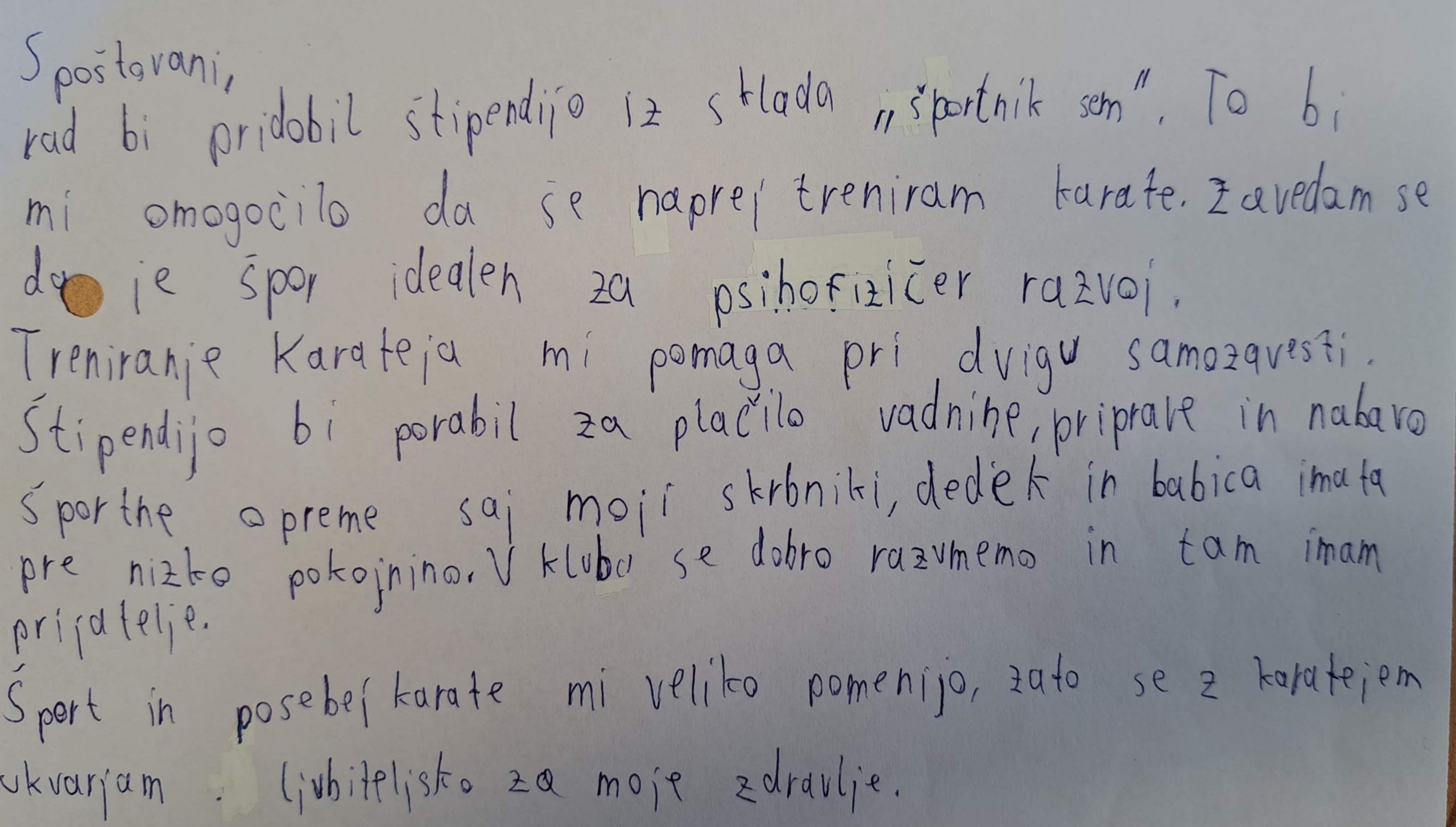 »Spoštovani. Rad bi pridobil štipendijo iz sklada »Športnik sem«. To bi mi omogočilo, da še naprej treniram karate. Zavedam se, da je šport idealen za psihofizičen razvoj. Treniranje karateja mi pomaga pri dvigu samozavesti. Štipendijo bi porabil za plačilo vadnine, priprave in nabavo športne opreme, saj moji skrbniki, dedek in babica, imata prenizko pokojnino. V klubu se dobro razumemo in tam imam prijatelje. Šport in posebej karate mi veliko pomenijo, zato se s karatejem ukvarjam. Ljubiteljsko za moje zdravje.«