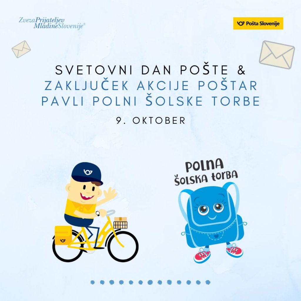 Pri Zvezi prijateljev mladine Slovenije pa na ta dan – 9. oktobra, že 10. leto zapored zaključujemo dobrodelno akcijo ‘Poštar Pavli polni šolske torbe’, ki je ena od družbeno odgovornih akcij Pošte Slovenije. V okviru akcije so na poštah zbirali šolske potrebščine in finančne prispevke za otroke iz socialno ogroženih družin.