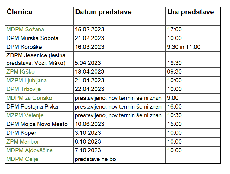 Spored predstav si lahko ogledate v spodnji tabeli, za več informacij glede udeležbe na predstavi pa se obrnite na svoje lokalno društvo.