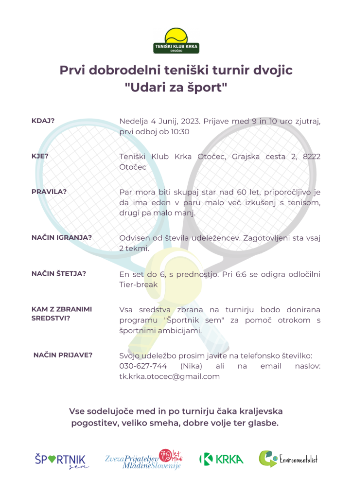 Na Zvezi prijateljev mladine Slovenije (ZPMS) smo za dober namen združili moči s Teniškim klubom Krka Otočec. Na Dolenjskem bo 4. junija potekal Dobrodelni teniški turnir dvojic »Udari za šport«. Vsa zbrana sredstva od dobrodelnega turnirja bodo namenjena socialno-humanitarnemu skladu Športnik sem pri ZPMS. Prijave so odprte za vse. Več podrobnosti najdete v vabilu v priponki. Vljudno vabljeni!