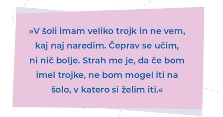 TOM POTUJE: Veliko učencev navaja, da se bojijo slabih ocen zaradi pričakovanj staršev. Strah jih je padca učnega uspeha in posledično nezmožnosti vpisa na želeno srednjo šolo. Nekaterim težave povzroča učenje, primanjkuje jim motivacije in volje. Drugi se soočajo s hudo tremo in strahom pred preizkusi znanja.