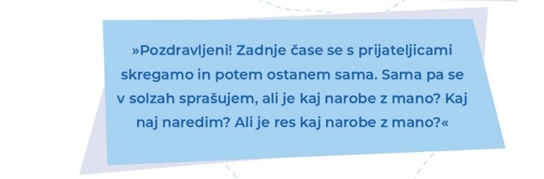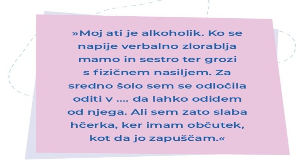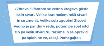 - Izstopa ugotovitev, da je med vsemi prejetimi zapisi zgolj 5 % učencev zapisalo, da nimajo težav oziroma lahko svoje težave delijo in rešujejo s starši. Iz preostalih 95 % zapisov učencev pa je mogoče razbrati, da svojih težav ne morejo zaupati staršem oziroma si ne upajo z njimi pogovoriti o tem, kar jih teži.