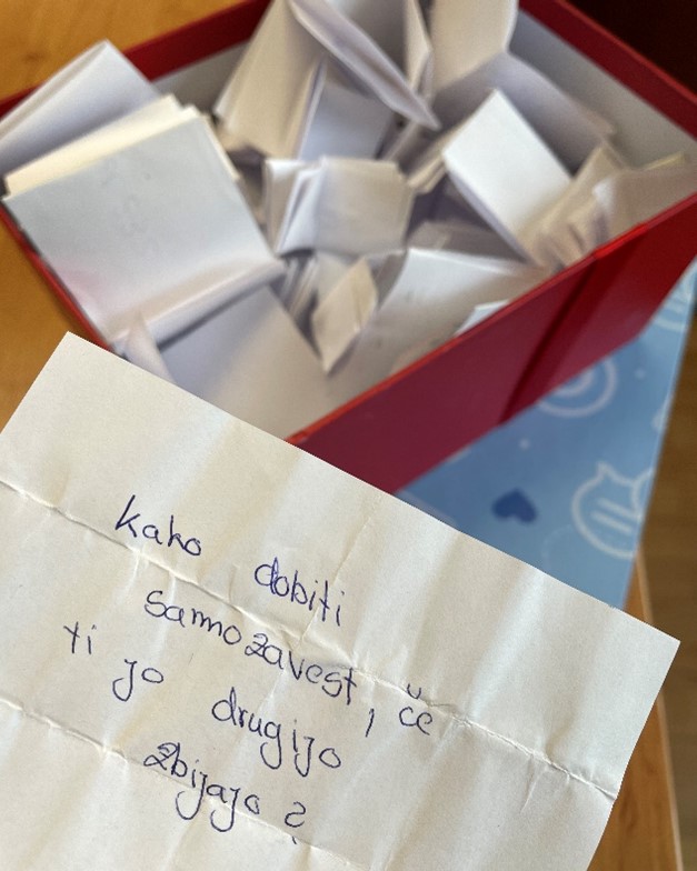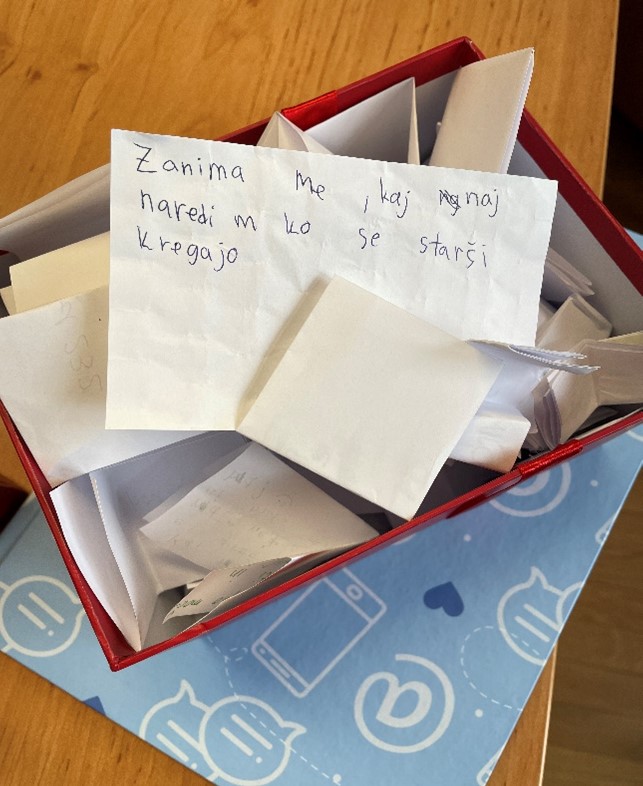 Celotna akcija, še posebej pa delavnica, je bila zastavljena na interaktiven način. Pomembno se nam je zdelo, da šole prosimo, da otrokom omogočijo in zagotovijo, da svoja vprašanja zapišejo in oddajo popolnoma anonimno. Z zagotovitvijo anonimnosti smo želel zaobiti tisto, kar nas ponavadi najbolj ovira, da bi spregovorili. Čutimo lahko strah, da bomo zavrnjeni ali morda sram, da se nam to sploh dogaja. Torej, učenci so teme, o katerih si ne upajo spregovoriti ali se pogovori s starši ali s kom odraslim, zapisali na listek, ga prepognili in oddali v škatlico. Vse zabrane listke je šola poslala na TOM telefon. Ko smo začeli z zbiranje in prebiranjem teh zapisov, smo bili enostavno ganjeni. Zavedali smo se, da je pred nami zelo dragocen vpogled v svet otrok.