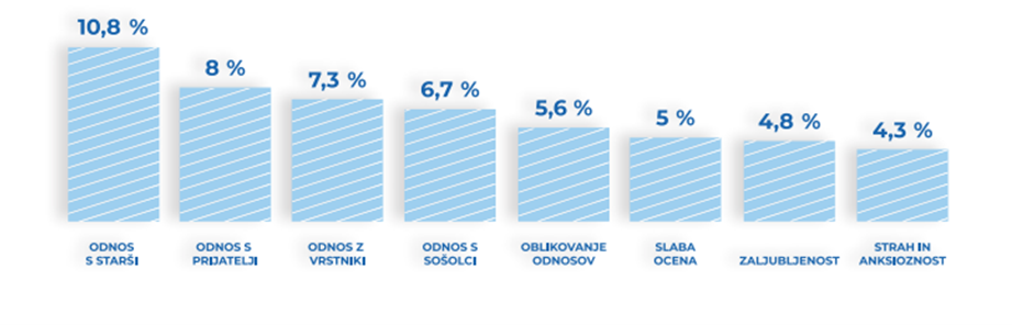 - Najbolj zastopane kategorije so: vrstniki, družina, šola, psihične težave, ljubezen, nasilje, spolnost. Vsak peti učenec je pisal o težavah z vrstniki, vsak peti o težavah v družini in vsak osmi o psihičnih težavah.