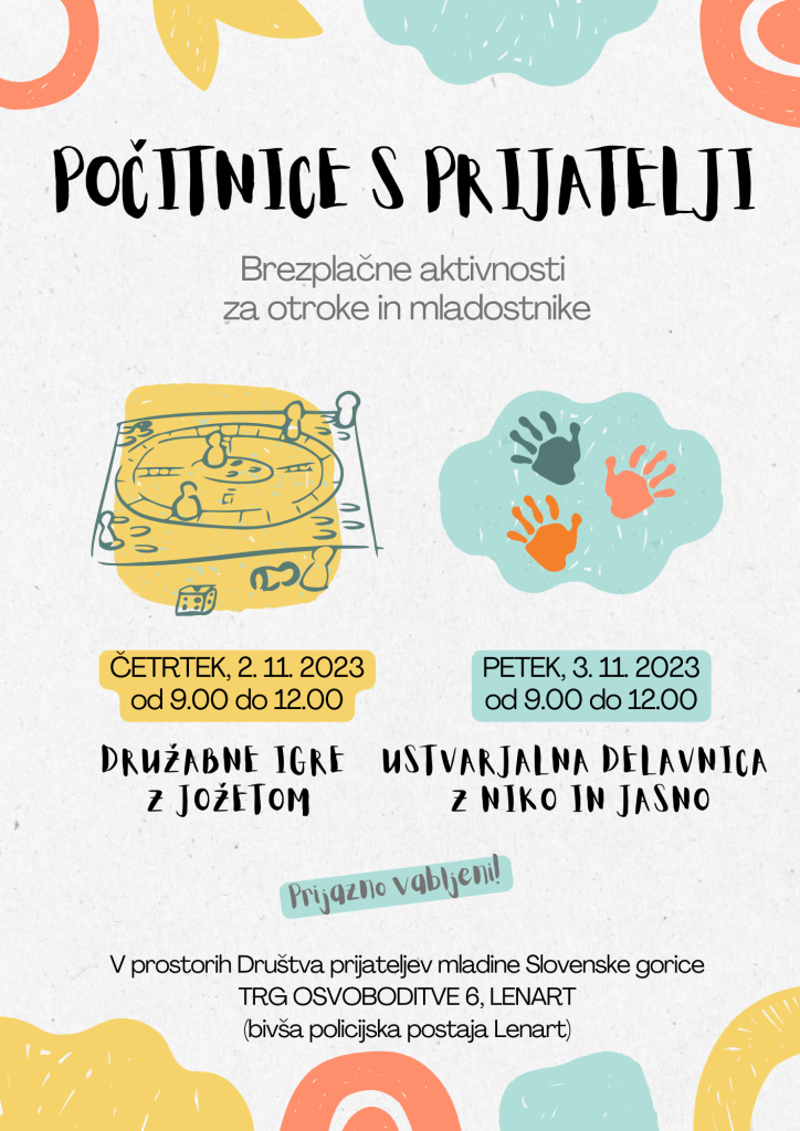Društvo prijateljev mladine Slovenske gorice vas z veseljem vabi na nepozabne počitnice s prijatelji, kjer bomo skupaj ustvarjali spomine in se zabavali na brezplačnih aktivnostih za otroke in mladostnike.
