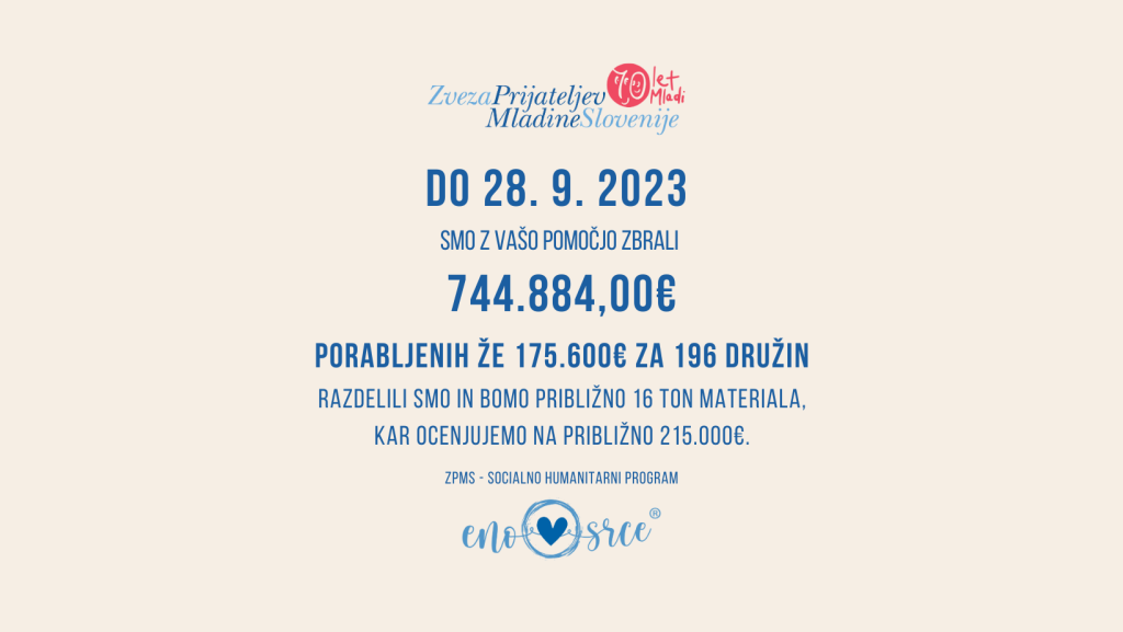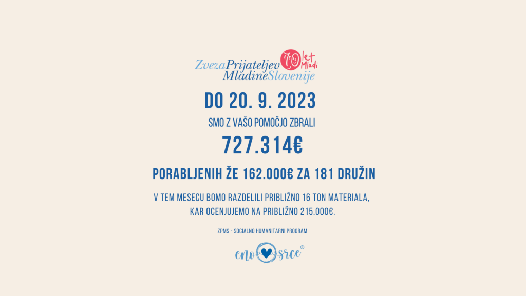 Z veseljem vas obveščamo, da smo do 28. septembra 2023 v zbrali 744.884 €, pri čemer smo pomagali kar 196 družinam z vrednostjo 175.600 €!