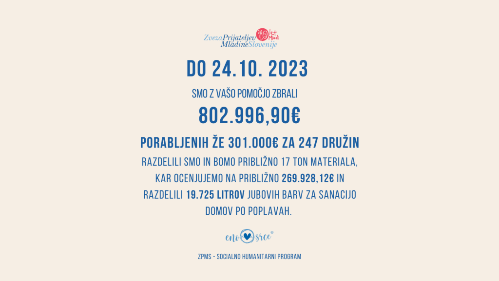Obveščamo, da smo s skupnimi močmi zbrali neverjetnih 802.996,90€ za pomoč žrtvam nedavnih poplav. Vaša podpora je bila ključna, in skupaj smo naredili ogromno razliko v življenjih mnogih ljudi.