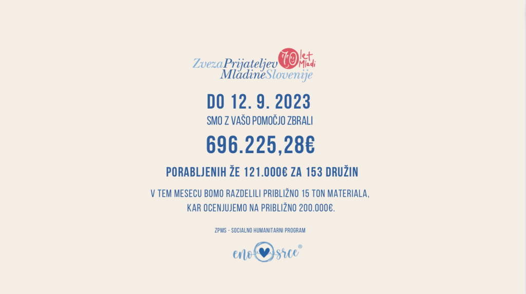 Z veseljem sporočamo, da smo do 12. septembra zbrali izjemno vsoto 696.225 € za pomoč družinam v stiski. Od tega zbranega zneska smo že razdelili 121.000 € med 153 družin, ki se soočajo s težkimi izzivi.
