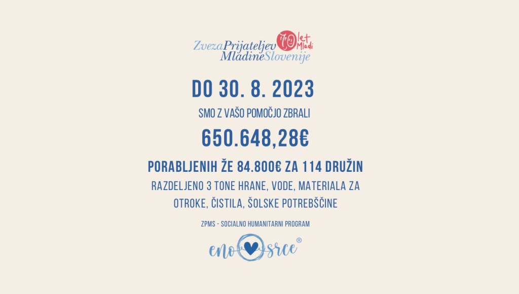 Z veseljem sporočamo, da smo do 30. avgusta 2023 uspeli doseči izjemne rezultate na Zvezi prijateljev mladine Slovenije. Skupaj z vašo velikodušno pomočjo, tako podjetij kot posameznikov, smo zbrali neverjetnih 650.648,28 €, od tega smo že porabili 84.800 € za pomoč kar 114 družinam v stiski.