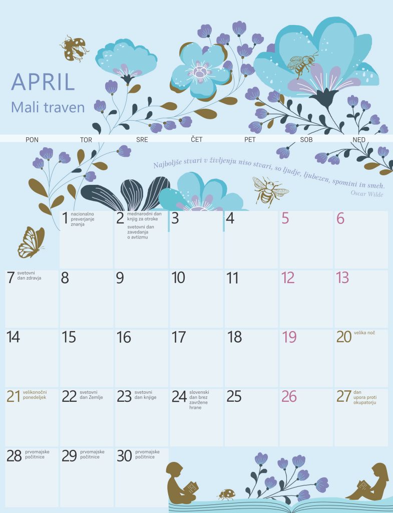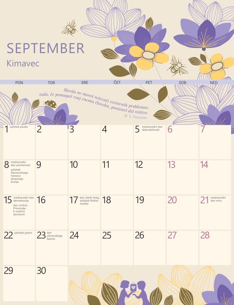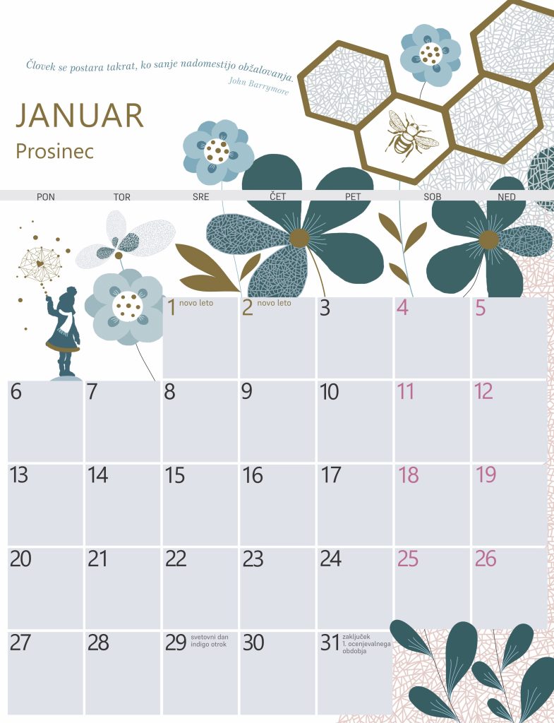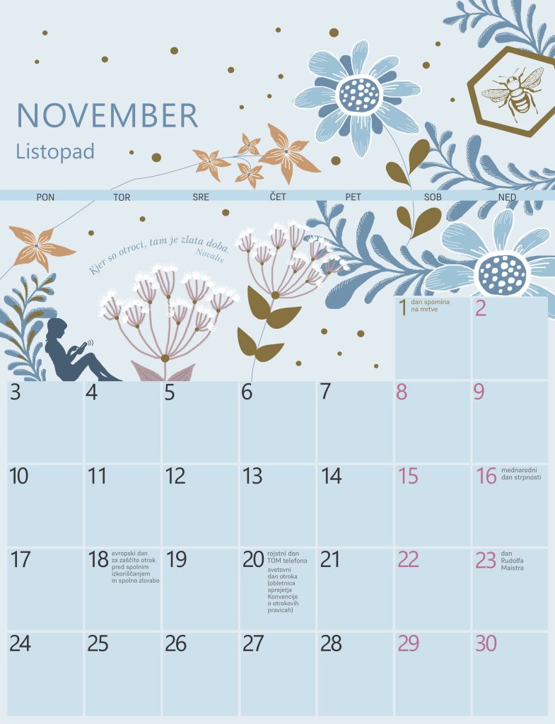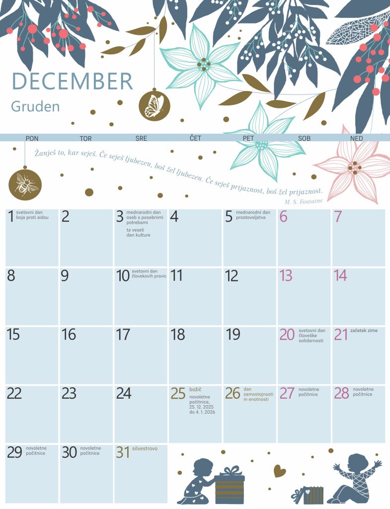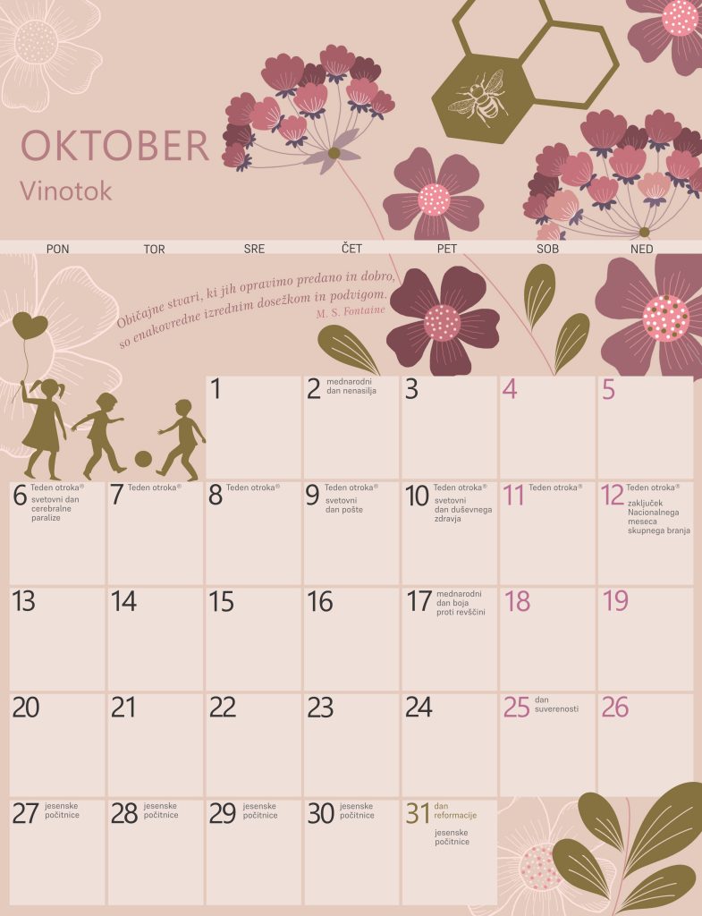 Posebna gostja letošnjega koledarja pa je – zlata čebelica. V vsakem mesecu se med rožicami nežno “sprehaja” čebelica, ki prinaša zlate trenutke v naš vsakdan. Ta drobna spremljevalka simbolizira marljivost, trdoživost, toplino in skrbnost, ki jo vnašamo v naše poslanstvo – izboljšanje kakovosti življenja otrok in družin.