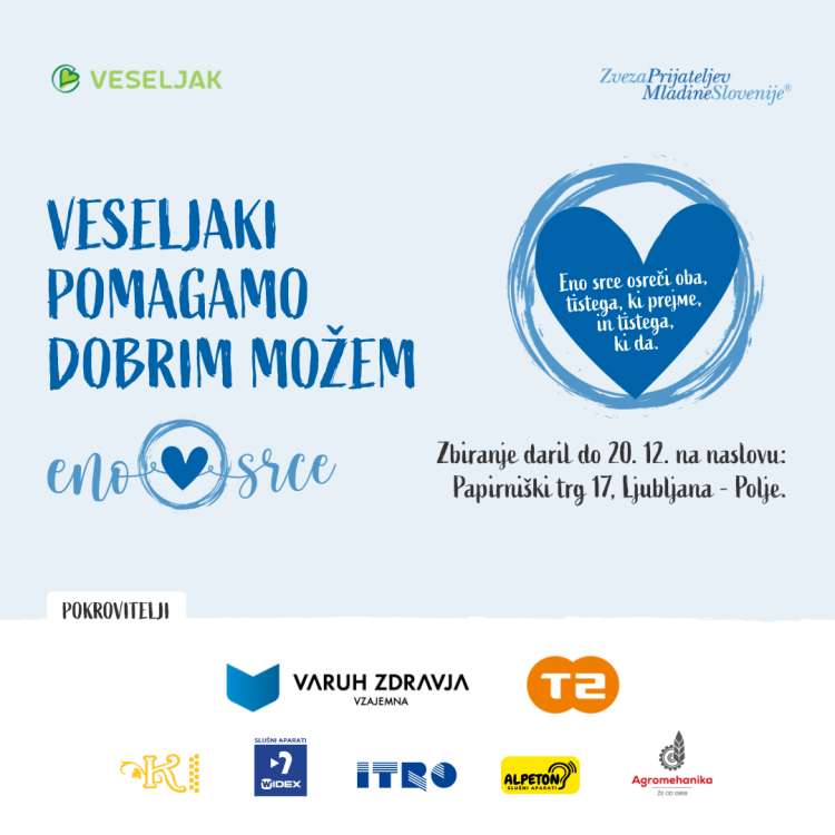 Poskrbimo, da se bodo na božično jutro zbudili z nasmeškom na obrazu. To lahko dosežemo le s skupnimi močmi. Naši skupni akciji vsako leto na pomoč priskočijo tudi slovenski glasbeniki in glasbenice ter celotna Veseljakova ekipa. Lani smo zbrali več sto prazničnih paketov, ki smo jih skrbno zložili odpeljali na Zvezo prijateljev mladine Slovenije, od koder so bila odpeljana k otrokom.