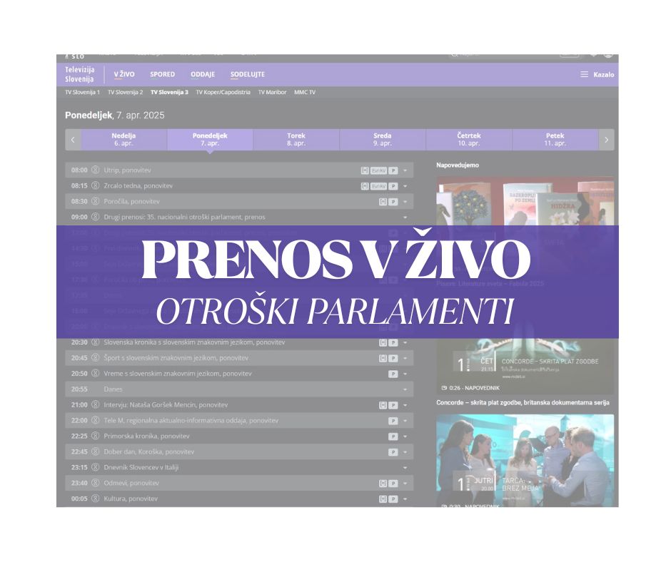 Vabljeni k ogledu prenosa 35. zasedanja Nacionalnega otroškega parlamenta, ki bo v živo na TV3. Mladi parlamentarci iz vse Slovenije bodo razpravljali o perečih vprašanjih današnje šole – od odnosov in učnih metod do tega, kako (ne)pripravljeni se počutijo na življenje.