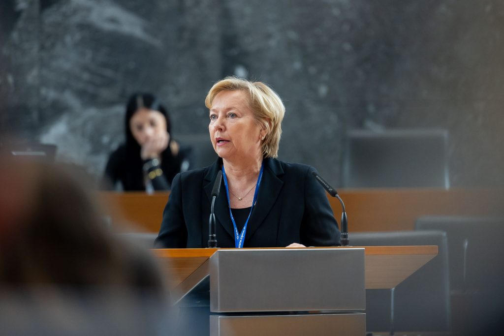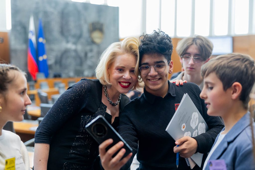 Predsednica Zveze prijateljev mladine Slovenije Darja Groznik je v uvodnem nagovoru poudarila pomen programa Otroški parlamenti® kot dragoceno priložnost za udejanjanje glasov otrok v demokratični družbi. Spomnila je na lanskoletno temo duševnega zdravja otrok in mladih ter odgovore državnih institucij na predloge otrok, obenem pa opozorila, da se mnogi programi za podporo že izvajajo, a so premalo prepoznavni. Izpostavila je pomen šole kot ključnega okolja mladih in poudarila, da je letošnja tema “Šolski sistem” lahko nadaljevanje razprav o duševnem zdravju, saj je šola pogosto vir stisk otrok. Udeležence je spodbudila k razpravi o štirih izbranih podtemah, ki bodo prispevale k oblikovanju skupnih ugotovitev in predlogov. Vsem zbranim je namenila tudi nekaj besed na temo uporabe telefonov: »Rada bi vas tudi pozvala, da razmišljate o pametnih tehnologijah – o telefonih, brez katerih skorajda ne znamo več živeti. Že lani je bil eden od vaših predlogov: odstraniti oziroma prepovedati telefone v šolah, razen kadar se uporabljajo pri pouku – pa še takrat naj bo to izjema. Zveza prijateljev mladine Slovenije se je pridružila pobudi Odklopi.net, ki jo je podprlo več kot 14 tisoč posameznikov in organizacij – med njimi Združenje pediatrov, številni ravnatelji osnovnih šol, aktivi staršev, strokovnjaki in drugi. Menimo, da je treba uporabo pametnih telefonov v šolskem okolju omejiti. Predloge smo že posredovali v okviru javne obravnave sprememb Zakona o osnovni šoli, zdaj pa vabimo tudi vas, da poveste svoje mnenje. Kako pomembna je po vašem mnenju uporaba digitalne tehnologije oziroma pametnih telefonov pri učenju? Kje vam koristi in kje ne? Ali je prav, da imate telefone pri sebi tudi med odmori? In – kaj vse bi lahko počeli, če jih takrat ne bi imeli? Veselim se vaših razmišljanj.