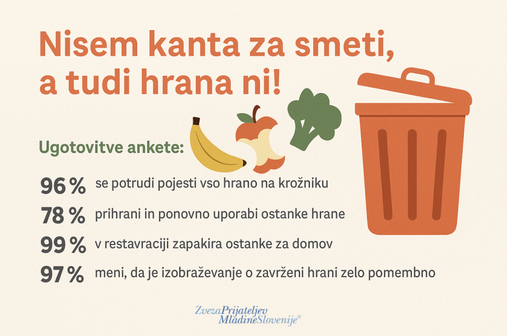 V preteklih dneh smo izvedli spletno anketno raziskavo z naslovom »Nisem kanta za smeti, a tudi hrana ni!«, s katero smo želeli izvedeti, kako posamezniki – zlasti mladi – razmišljajo o hrani, obrokih in ravnanju z ostanki hrane. Anketa je bila del našega širšega ozaveščevalnega programa, ki se letos še posebej osredotoča na pomen izobraževanja in vsakodnevnih navad.
