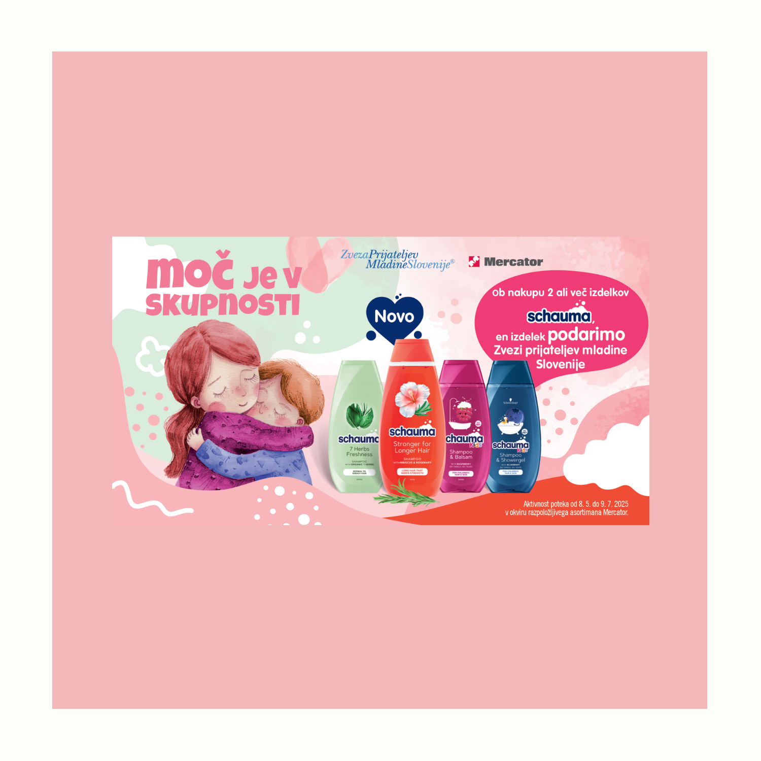 V dobrodelni akciji »Moč je v skupnosti«, ki poteka od 8. 5. do 9. 7. 2025, Mercator ob nakupu dveh ali več izdelkov Schauma, en izdelek podari Zvezi prijateljev mladine Slovenije.