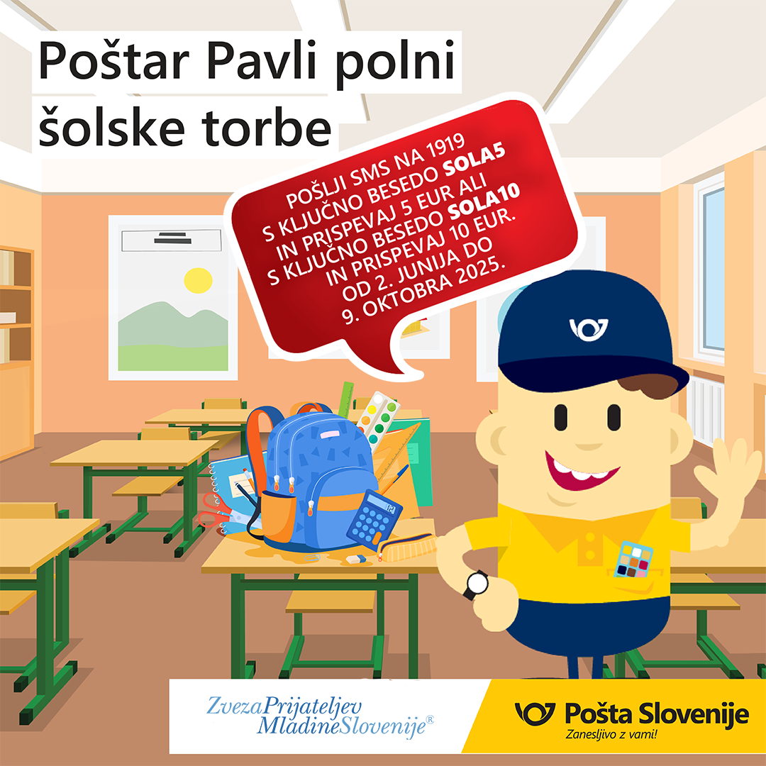 Do 8. avgusta 2025 poteka na poštah po vsej Sloveniji zbiranje šolskih potrebščin. V prave roke (in torbe, seveda) bo prišlo vse: od zvezkov in barvic do šestil, nalivnih peres in ovitkov.