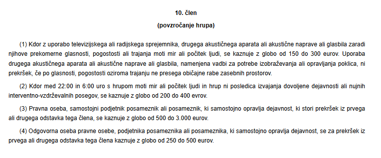 Pred sprejetjem novega zakona je Zakon o varstvu javnega reda in miru v 10. členu določal, da: »Kdor z uporabo … akustične naprave ali glasbila moti mir ali počitek ljudi in to ni posledica dovoljene dejavnosti, se kaznuje z globo 150 do 300 evrov.«