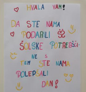 Za otroke zbiramo: A5 zvezki, A4 zvezki (črtasti, veliki karo, mali karo, prazni), navadni svinčniki, barvice, voščenke, flomastri, nalivniki, brisalci, šestilo, geotrikotnik, ravnilo s šablono, radirka, šilček, škarje, lepilo v stiku, risalni blok, čopiči, vodene barvice, tempere, trde kartonaste mape, torbe za višje triade ali srednjo šolo (nahrbtniki), …